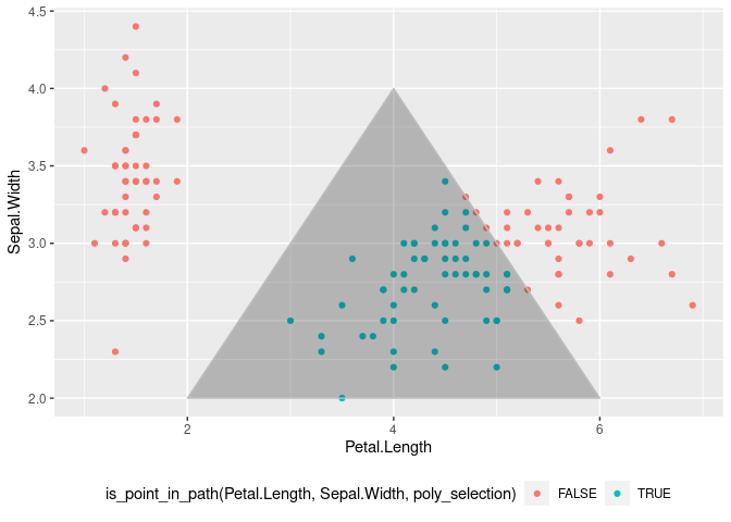 iris2 <- dplyr::mutate( iris, point_in_poly = is_point_in_path( Petal.Length, Sepal.Width, poly_selection)) head(iris2) #> Sepal.Length Sepal.Width Petal.Length Petal.Width Species point_in_poly #> 1 5.1 3.5 1.4 0.2 setosa FALSE #> 2 4.9 3.0 1.4 0.2 setosa FALSE #> 3 4.7 3.2 1.3 0.2 setosa FALSE #> 4 4.6 3.1 1.5 0.2 setosa FALSE #> 5 5.0 3.6 1.4 0.2 setosa FALSE #> 6 5.4 3.9 1.7 0.4 setosa FALSE